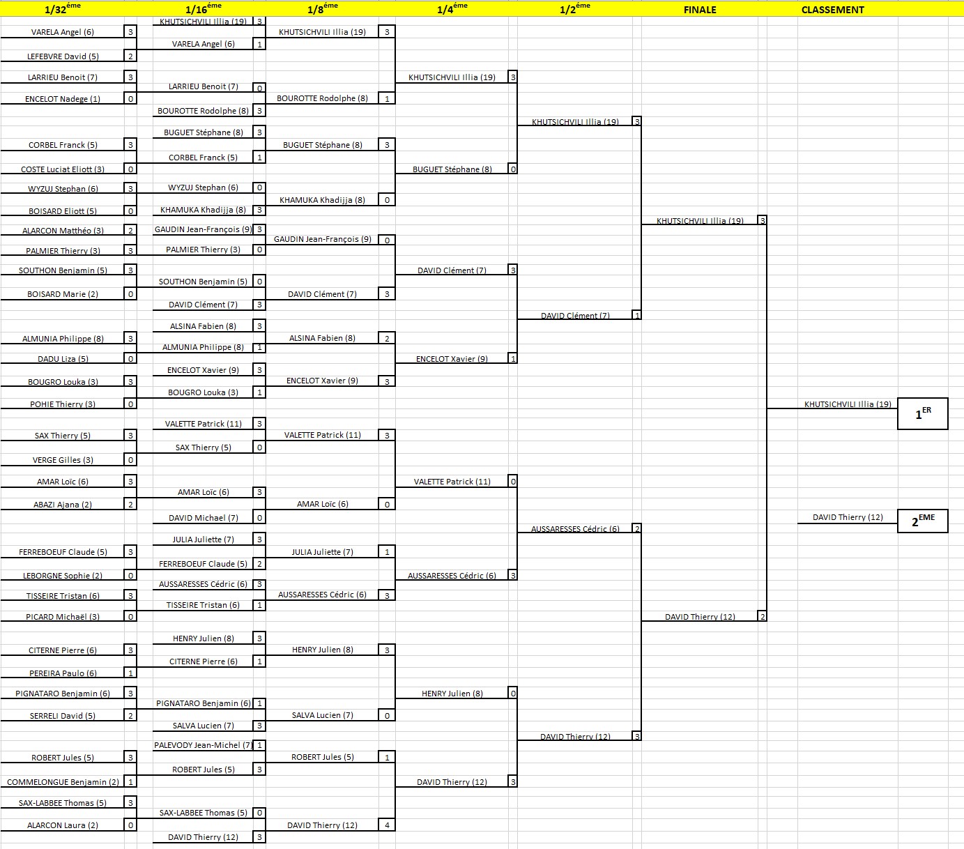 Quelle réussite ! Et quel niveau de jeu ! 200 matchs disputés, une intensité remarquable, des demi-finales acharnées et une finale de toute beauté remportée à la belle par Illia Khutsichvili (classé 19) du club de Montauban face à Thierry David (classé 12) du club de Castelsarrasin. La 3ème marche du podium a été décrochée brillamment par Cédric Aussaresses (classé 6) du club parisien US Métro, qui a commencé la pratique du tennis de table il y a moins de 2 ans… au club de Boussens !