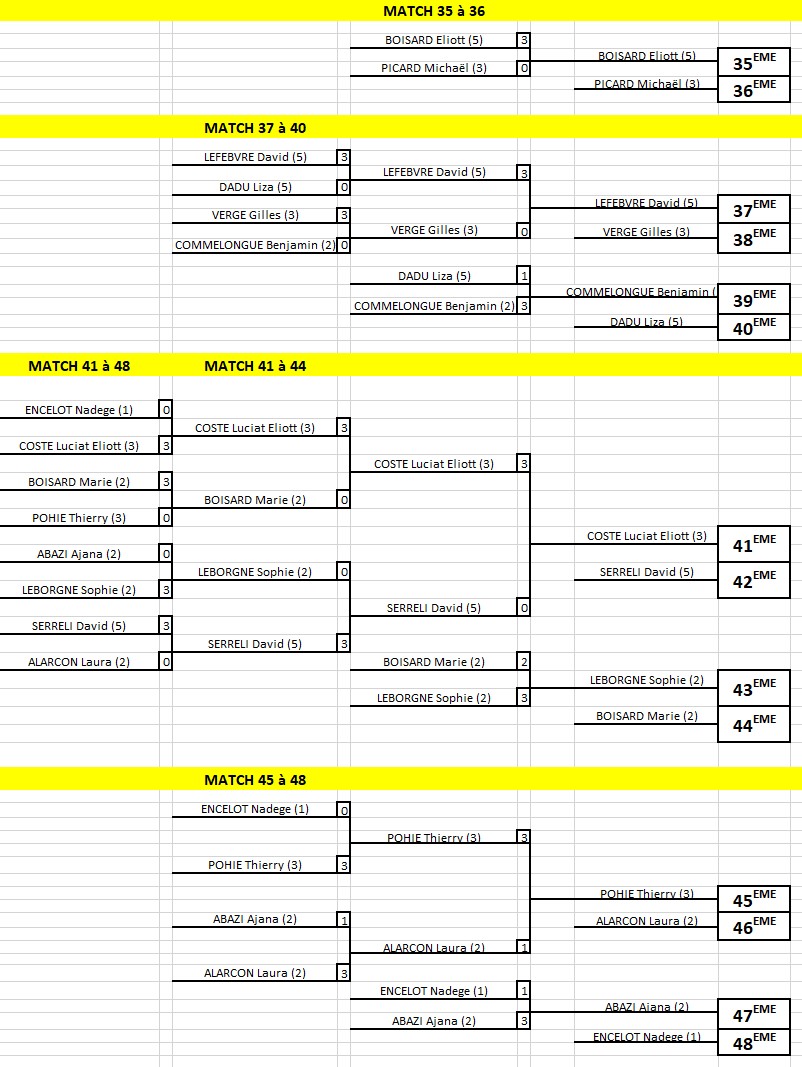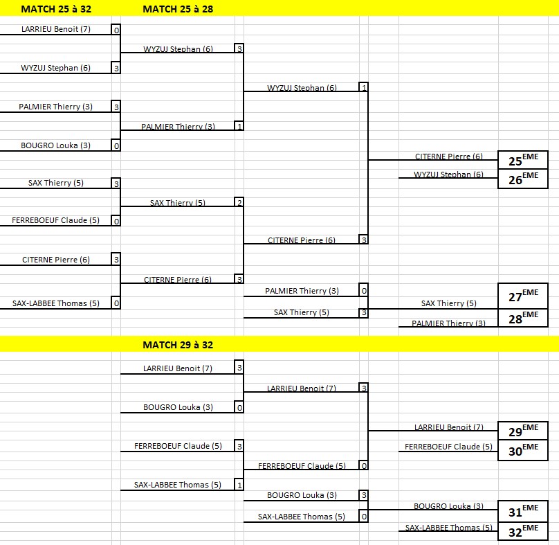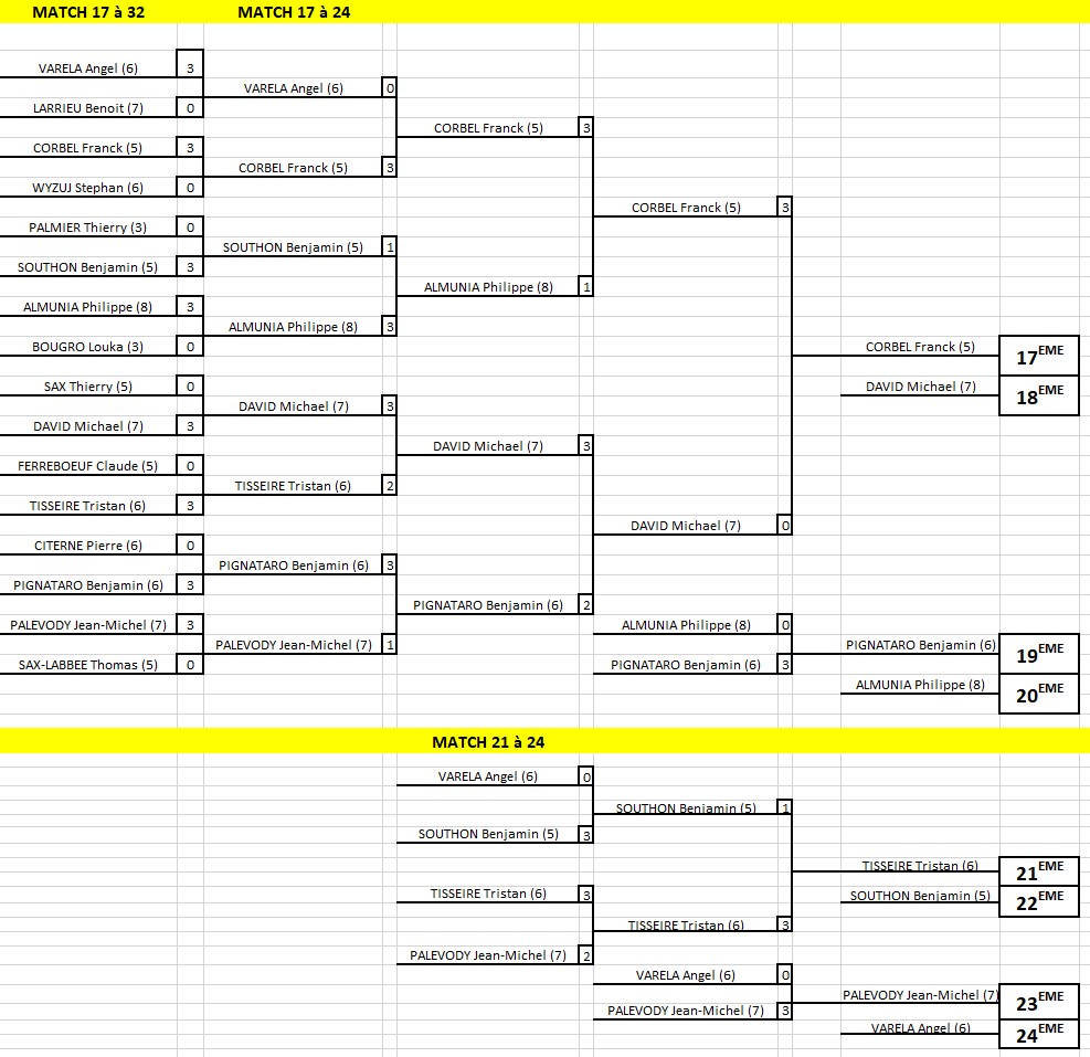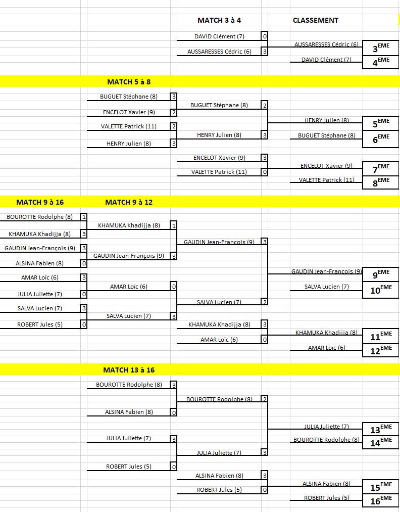 48 joueurs se sont affrontés le samedi 6 décembre, toute la journée, dans un tournoi par handicap à tableau unique avec classement intégral (le handicap signifiant qu’il y avait un avantage de points pour un joueur non classé face à un joueur classé, et le classement intégral que chaque participant jouait autant de matchs que les finalistes).